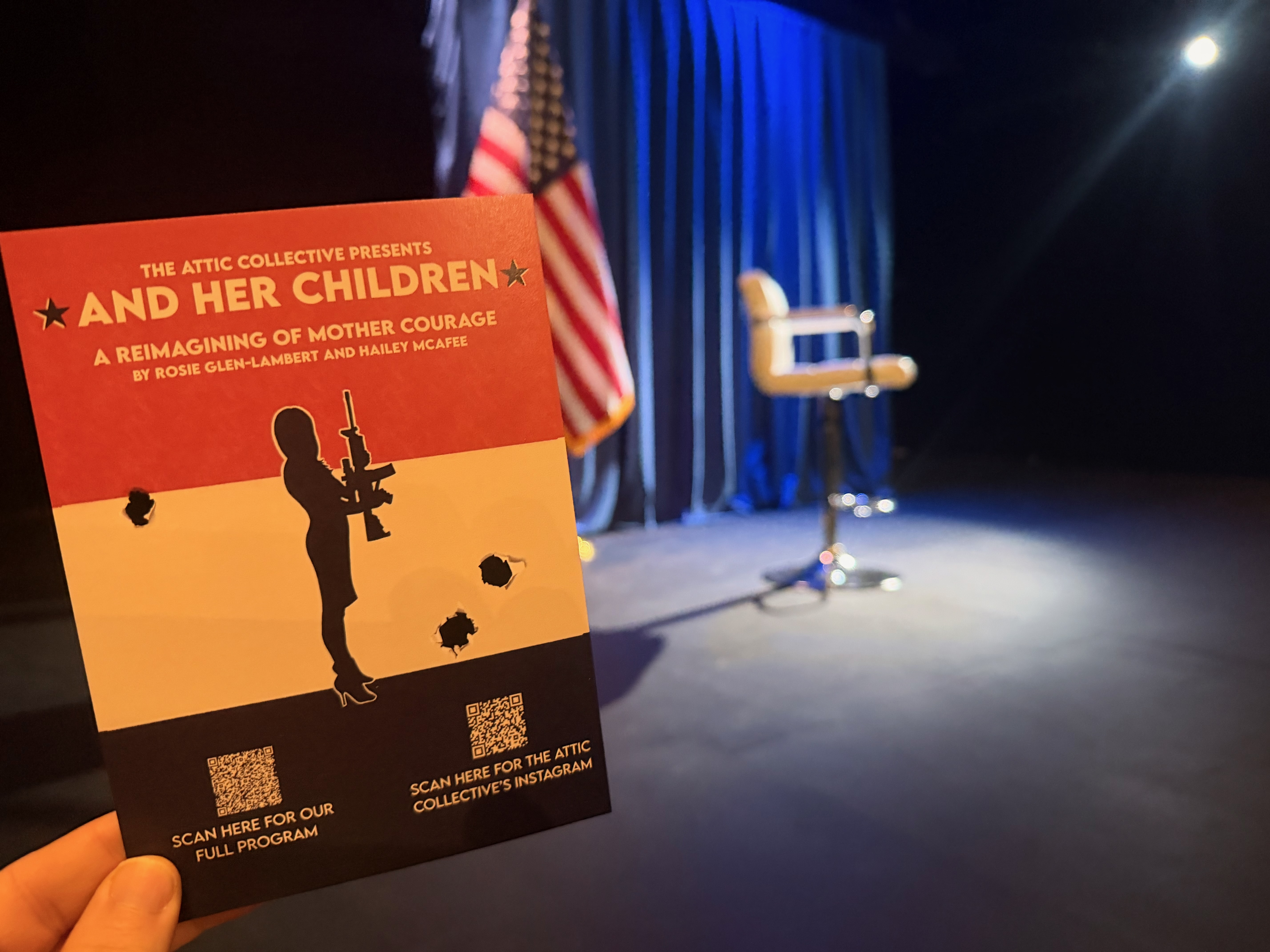 Written by Rosie Glen-Lambert and Hailey McAfee, and her Children takes Brecht’s Mother Courage and drops it squarely into modern America by reimagining Anna Fierling as a public facing NRA spokesperson. The show places her in a suspended, almost purgatorial space where time stops and there is nowhere left to hide behind talking points or rehearsed rhetoric. The audience becomes the stand in for her own conscience as she is forced to confront the cost of the role she has chosen to play. This is not a literal retelling of Brecht’s story, but a psychological and moral reckoning that asks what happens when belief, career, and survival collide. The central tension is brutally simple and deeply unsettling: has she already given up everything that truly matters, and if so, will she continue anyway?