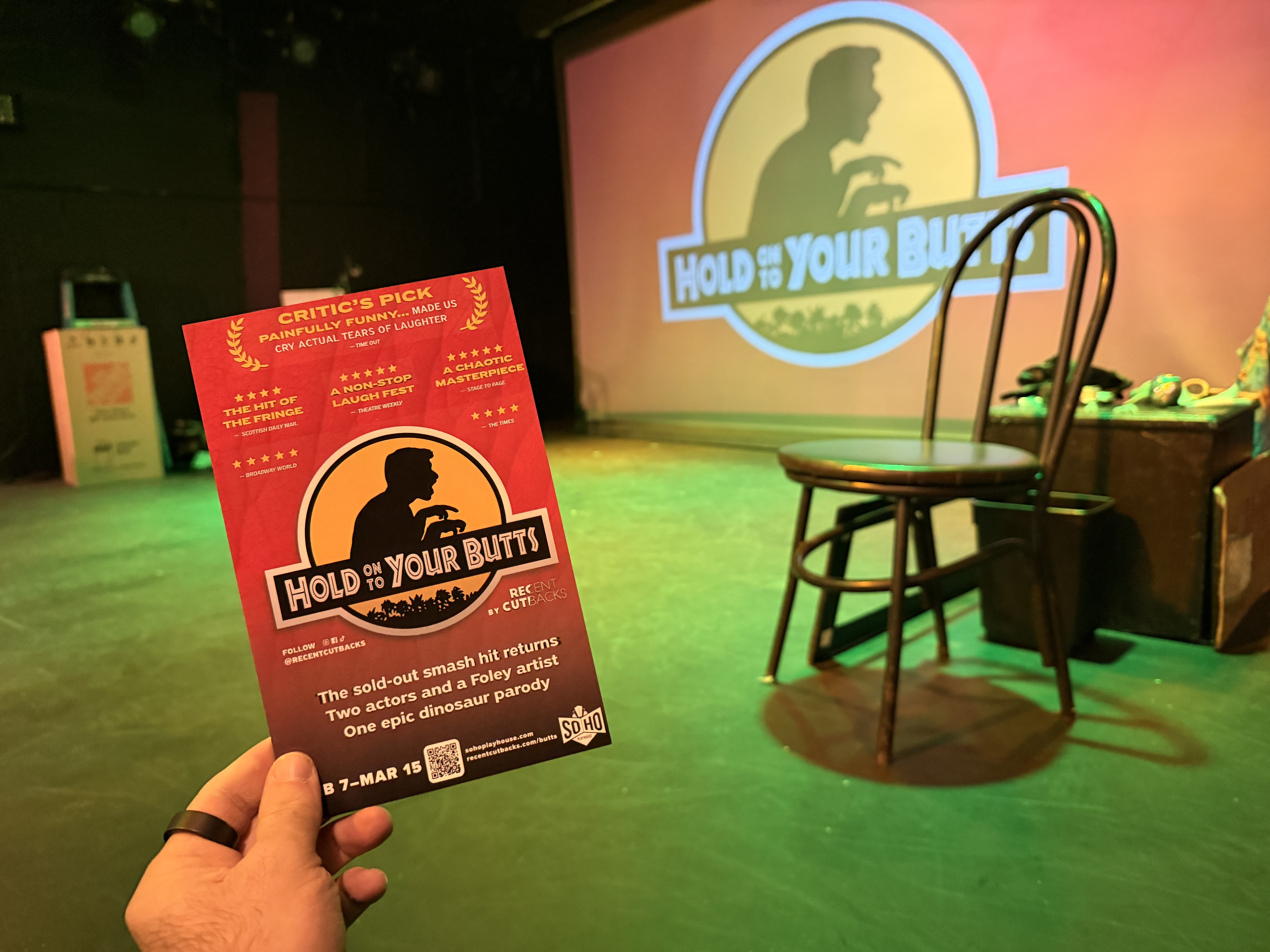 The lo-fi brilliance of Recent Cutbacks has returned to New York with Hold On To Your Butts and the 60-minute non-stop laugh fest at SoHo Playhouse is a prehistoric triumph. This shot-for-shot parody of Jurassic Park relies on nothing but physical theater, a handful of simple props, and pure comedic timing to recreate Spielberg’s epic blockbuster. Starring Nick Abeel, Kerry Ipema, and Natalie Rich, the ensemble is remarkably tight. Watching the performers take on every single role, including the dinosaurs, is a masterclass in imaginative acting. A particular highlight for me was seeing both leads deliver pitch-perfect, bumbling Jeff Goldblum impressions that had the audience in stitches.